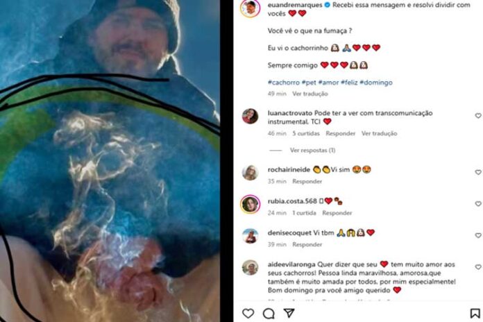 “Eu recebi uma DM aqui no Instagram. De vez em quando, fico lendo algumas [mensagens] aí eu recebi isso aqui. ‘Olhei essa foto e vi você abraçado a um cachorrinho’. Aí eu dei um zoom e realmente eu consigo ver um cachorrinho nessa imagem”, revelou André.