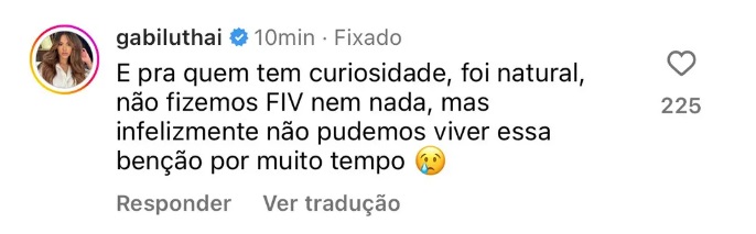 Gabi disse ainda que tem sido uma jornada desafiadora lidar com a perda de um de seus bebês, o que lhe causou depressão e também a ensinou a ser forte. “E é aquilo que eu sempre digo: por trás da tela existem seres humanos, que a gente nunca sabe de fato o que está se passando”, completou.