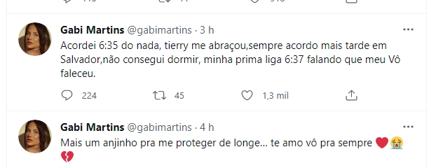 “Acordei 6h35 do nada, Tierry me abraçou. Sempre acordo mais tarde em Salvador. Não consegui dormir. Minha prima liga 6h37 falando que meu vô faleceu. A gente sente, o corpo sente. Deus cuida bem do meu avô”. declarou ela.