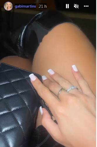 Na quarta-feira (02), Gabi Martins publicou um Story onde faz questão de exibir um anel supostamente do noivado com Tierry. A cantora também mostrou fotos de comida, dando indícios que estava em um jantar romântico, possivelmente com o ex-ex, atual noivo.