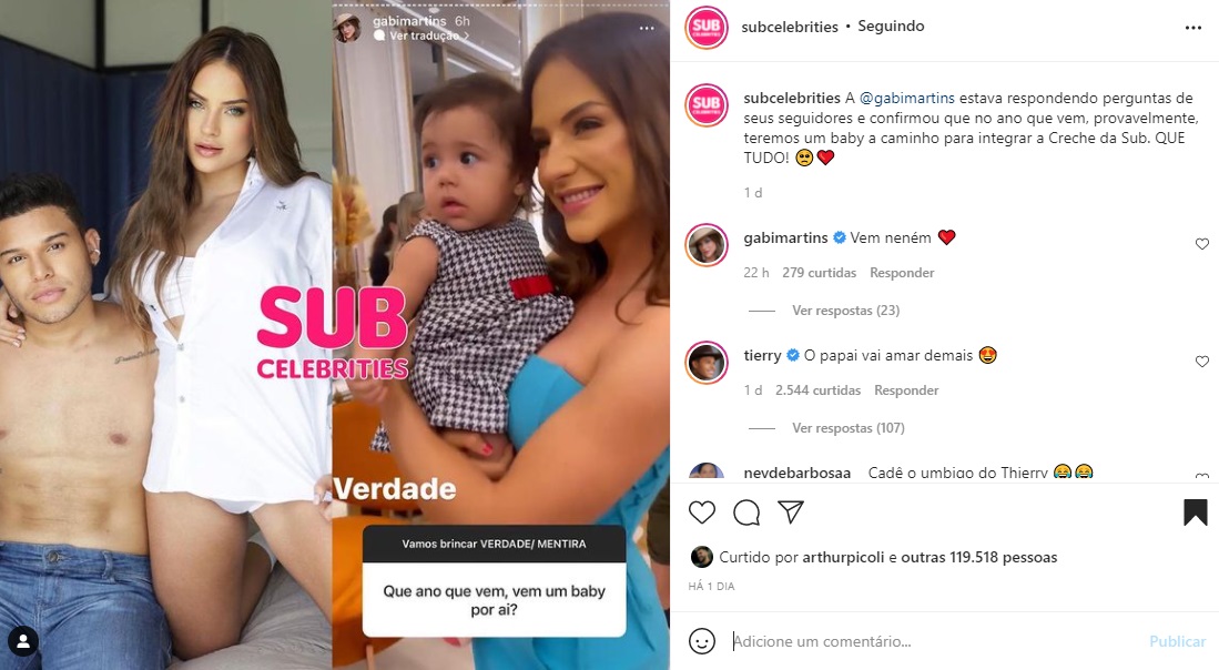 A página Subcelebrities fez questão de comentar sobre o assunto. Sendo assim, em sua postagem, escreveu: “A @gabimartins estava respondendo perguntas de seus seguidores e confirmou que no ano que vem, provavelmente, teremos um baby a caminho para integrar a Creche da Sub. QUE TUDO!”.