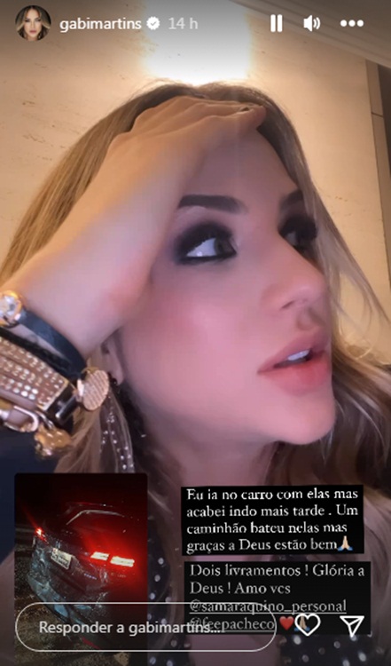 Gabi lembrou também que a ideia inicial era de que ela fosse mais cedo com algumas amigas, no entanto, por conta de alguns compromissos, precisou ir mais tarde. Mas de qualquer maneira, artista não escaparia de um transtorno. Momentos mais tarde, ela recebeu a notícia de um acidente dessas amigas com um caminhão. Felizmente, ninguém se feriu. “Um caminhão bateu nelas, mas, graças a Deus, estão bem”, finalizou.