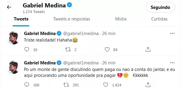 Dessa forma, por meio de suas redes sociais, Gabriel Medina resolveu se pronunciar sobre o assunto e afirmou que enquanto muitos não querem pagar a conta, ele só procura uma oportunidade para fazer isso por alguém que lhe trate com amor e carinho. “Um monte de gente discutindo quem paga ou não a conta do jantar, e eu aqui procurando uma oportunidade para pagar. Triste realidade”, escreveu o atleta, adicionando um emoji de coração partido, outro de carinha triste e risadas ao fim do post.