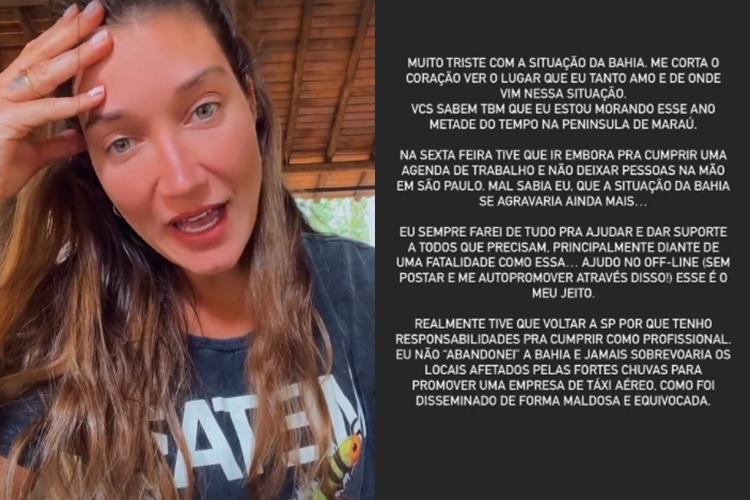Em seu Instagram, a influenciadora se defendeu. “Muito triste com a situação da Bahia. Me corta o coração ver o lugar que eu tanto amo, e de onde vim, nessa situação. Vocês também sabem que eu estou morando esse ano metade do tempo na Península de Maraú. Na sexta-feira tive que ir embora para cumprir uma agenda de trabalho e não deixar pessoas em São Paulo na mão”, disse.