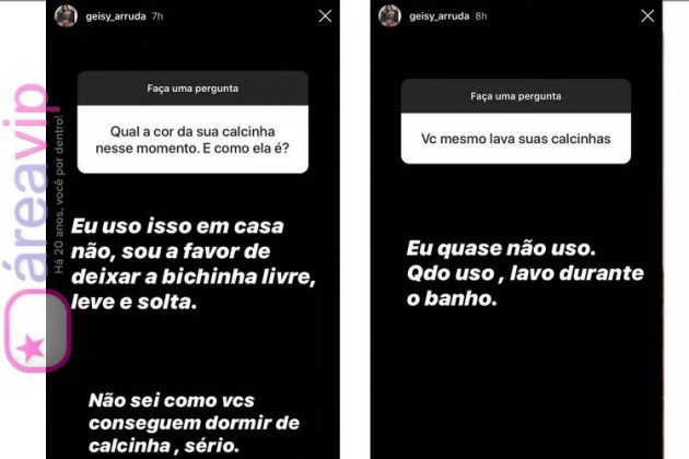 Por meio do recurso Stories do Instagram, a modelo contou que não possui costume de usá-las. “Eu isso isso em casa não, sou a favor de deixar a bichinha livre, leve e solta. Não sei como vocês conseguem dormir de calcinha, sério”, disse. Em outro momento, um fã a questionou sobre a higienização das suas peças íntimas e ela, então, falou que evita usar, mas destacou: “Eu quase não uso. Quando uso, lavo durante o banho”.