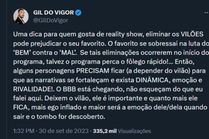 Gil continuou sua argumentação e deixou claro que estava falando da próxima edição do BBB. ‘‘Então, alguns personagens PRECISAM ficar (a depender do vilão) para que as narrativas se fortaleçam e exista DINÂMICA, emoção e RIVALIDADE!. O BBB está chegando, não esqueçam do que eu falei aqui. Deixem o vilão, ele é importante e quanto mais ele FICA, mais ego inflado e maior será a emoção dele/dela quando sair e o tombo for descoberto’’.