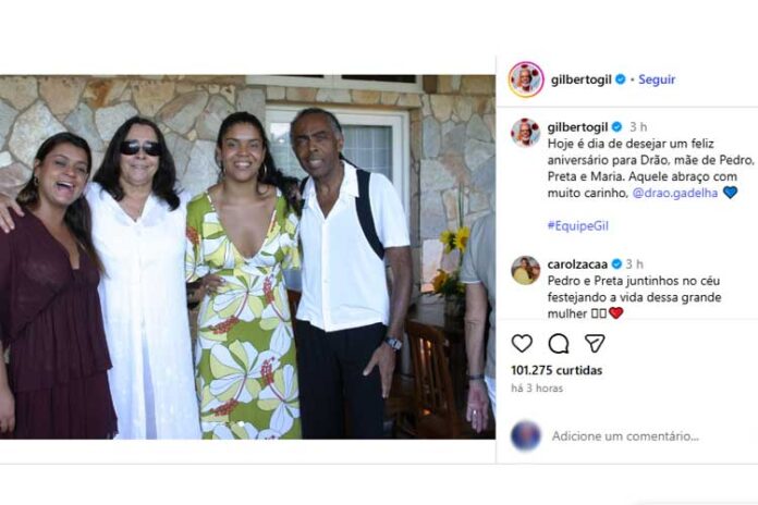 Compartilhando um álbum com fotografias da família, Gilberto resgatou momentos nostálgicos ao lado da Gadelha e dos filhos. “Hoje é dia de desejar um feliz aniversário para Drão, mãe de Pedro, Preta e Maria. Aquele abraço com muito carinho”, declarou o artista.