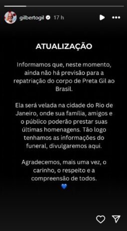 Em nota oficial, no Instagram, Gilberto Gil afirmou: “Informamos que, neste momento, ainda não há previsão para a repatriação do corpo de Preta Gil ao Brasil“, escreveu. “Ela será velada na cidade do Rio de Janeiro, onde sua família, amigos e o público poderão prestar suas últimas homenagens“, disse.
