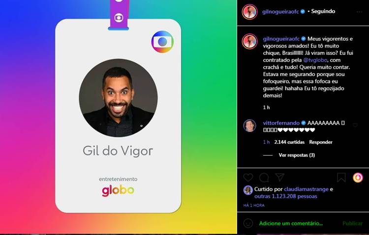 Em seu perfil no Instagram, o vigoroso comemorou. “Meus vigorentos e vigorosos amados! Eu tô muito chique, Brasillllll! Já viram isso? Eu fui contratado pela @tvglobo, com crachá e tudo!”, anunciou.