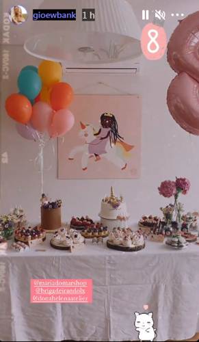 No Instagram, Giovanna mostrou a mesa de bolo e explicou que o tema para a festa foi escolhido pela própria Titi: “Hoje é aniversário da minha princesa. Olha que coisa mais linda. Ela quis uma decoração de unicórnio e arco-íris. Estou muito apaixonada”, disse a mamãe coruja.