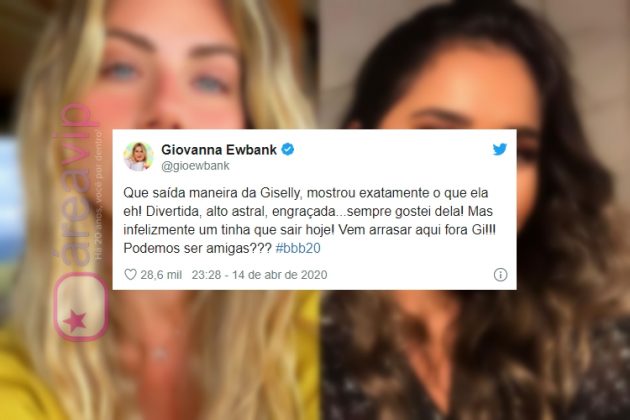 Assim como o marido Bruno Gagliasso, Giovanna Ewbank repercutiu as reviravoltas que aconteceram na casa mais vigiada do Brasil, e comentou acerca da saída da advogada criminalista. “Que saída maneira da Gizelly, mostrou exatamente o que ela eh! Divertida, alto astral, engraçada…sempre gostei dela! Mas infelizmente um tinha que sair hoje!”, disse a atriz e apresentadora, que não poderia dispensar o momento e fez uma proposta irrecusável e animadora à capixaba: “Vem arrasar aqui fora Gi! Podemos ser amigas?”, questionou.
