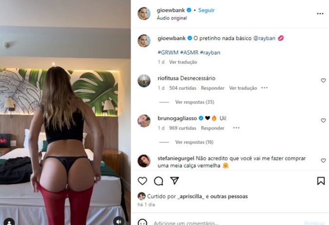“O pretinho nada básico @rayban“, escreveu a artista na legenda. Nos comentários, Bruno Gagliasso reagiu com emojis de fogo e coração: “Ui“, disse ele, apenas. “Desnecessário“, criticou uma internauta adiante. “Antes as pessoas se trocavam e ninguém via hoje em dia se trocam em frente uma câmera e está tudo normal kkkkkkk“, riu outra. “Não acredito mulher, que coisa chata, tem criança nessa rede“, disparou mais uma.