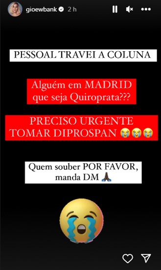 Nos stories do Instagram, Giovanna Ewbank fez um post para dizer que travou a coluna e precisa de um especialista. “Pessoal, travei a coluna. Alguém em Madrid que seja quiroprata? Preciso urgente”, escreveu ela na rede social no final da manhã deste domingo (01).