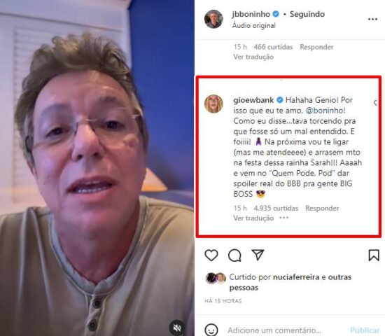 No entanto, rapidamente ela se pronunciou nos comentários: “Hahaha Genio! Por isso que eu te amo, @boninho! Como eu disse…tava torcendo pra que fosse só um mal entendido. E foiiii! Na próxima vou te ligar (mas me atendeeee) e arrasem mto na festa dessa rainha Sarah!!! Aaaah e vem no “Quem Pode, Pod” dar spoiler real do BBB pra gente BIG BOSS”, disse ela.