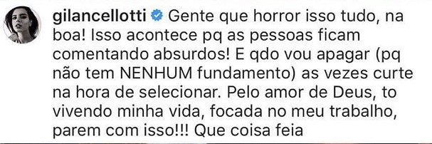 “Gente, que horror isso tudo, na boa! Isso acontece porque as pessoas ficam comentando absurdos! E quando vou apagar (porque não tem NENHUM fundamento) às vezes curte na hora de selecionar. Pelo amor de Deus, tô vivendo minha vida, focada no meu trabalho, parem com isso!!! Que coisa feia”, escreveu a atriz.
