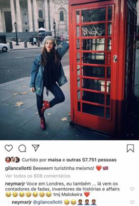 O jogador Neymar Jr, que tem sido cotado como novo affair da atriz, aproveitou a publicação de Giovanna e ironizou nos comentários. “Você em Londres, eu também… Lá vem os contadores de fadas, inventores de histórias e affais. Tamo junto malokeira”, brincou.