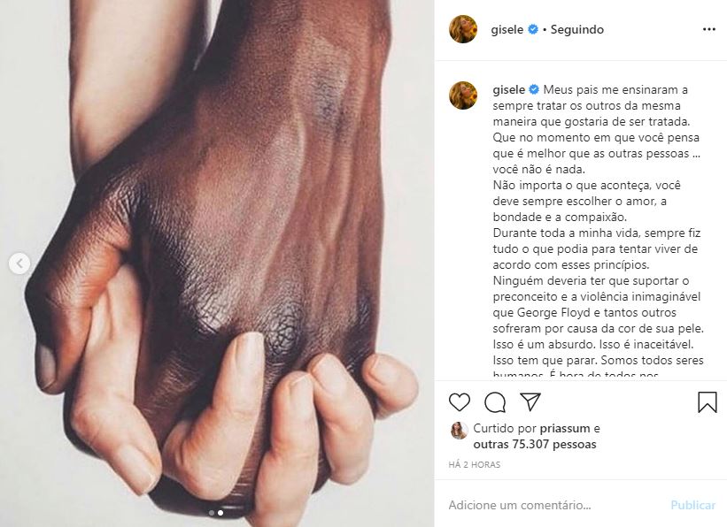 Gisele seguiu mostrando sua indignação sobre a história. “Isso é um absurdo. Isso é inaceitável. Isso tem que parar. Somos todos seres humanos. É hora de todos nos unirmos e enfrentarmos a violência e o racismo. E se tratássemos ao próximo da maneira como gostaríamos de ser tratados? E se escolhêssemos ser mais amorosos, bondosos e solidários com nossos irmãos e irmãs?”.