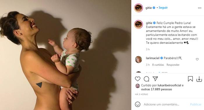 Na legenda, ela se declarou ao pequeno. “Feliz Cumple Pedro Luna! Exatamente há um a gente estava se amamentando de muito Amor! eu, particularmente estava levitando com você no meu colo… amor, amor meu!!! Te quiero demasiadamente ♥”, escreveu.
