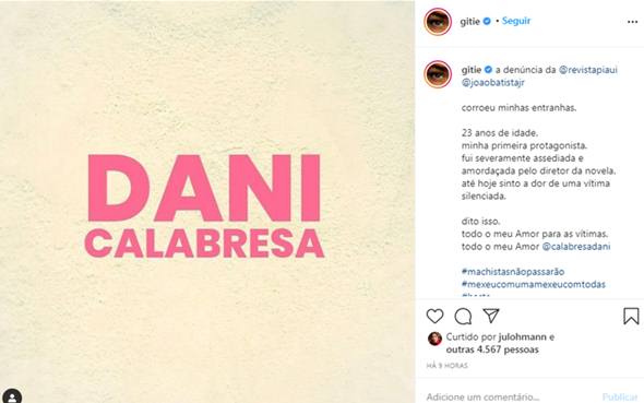 Ela fez um post com a imagem do nome da humorista. “a denúncia da @revistapiaui @joaobatistajr corroeu minhas entranhas. 23 anos de idade. minha primeira protagonista. fui severamente assediada e amordaçada pelo diretor da novela”, desabafou.