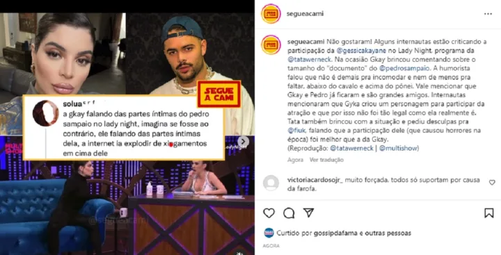 ”A Gkay falando das partes íntimas do Pedro Sampaio no Lady Night, imagina se fosse o contrário, ele falando das partes íntimas dela, a internet ia explodir de xingamentos em cima dele”, disse um tuíte que viralizou bastante.