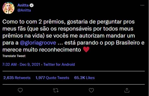 No Twitter, ela os consultou para saber se pode, já que foi através deles que conquistou os prêmios da noite, oferecer uma das estatuetas para Gloria Groove e justificou: “Como to com 2 prêmios, gostaria de perguntar pros meus fãs (que são os responsáveis por todos meus prêmios na vida) se vocês me autorizam mandar um para a @gloriagroove … está parando o pop Brasileiro e merece muito reconhecimento”, escreveu no microblog.