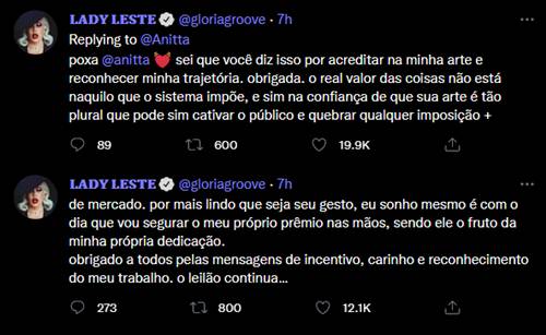 Ela continuou justificando. “Por mais lindo que seja seu gesto, eu sonho mesmo é com o dia em que vou segurar o meu próprio prêmio nas mãos, sendo ele o fruto da minha própria dedicação. Obrigado a todos pelas mensagens de incentivo, carinho e reconhecimento do meu trabalho. O leilão continua…”, finalizou.