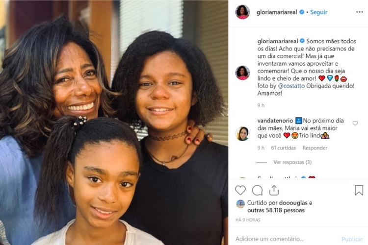 Em seu Instagram, Glória Maria compartilhou uma foto com as duas filhas, Laura e Maria e na legenda da publciação, a jornalista refletiu sobre consideração e sobre a data: “Somos mães todos os dias! Acho que não precisamos de um dia comercial”, iniciou.