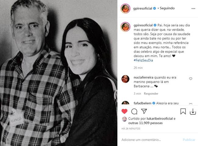Ela publicou uma foto antiga ao lado do pai para lembrar do aniversário. “Pai, hoje seria seu dia mas queria dizer que, na verdade, todos são. Seja por causa da saudade que ainda bate no peito ou por ter sido meu exemplo, minha referência em atuação, meu norte… Todos os dias celebro algo de especial que deixou em mim. Te amo! #FelizSeuDia”, escreveu a atriz na legenda.