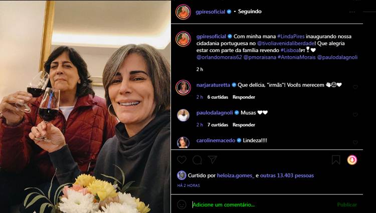 Na imagem, as duas aparecem segurando suas respectivas taças de vinho e celebrando a vida. “Com minha mana #LindaPires inaugurando nossa cidadania portuguesa no @tivoliavenidaliberdade! Que alegria estar com parte da família revendo #Lisboa! ❤”, escreveu, marcando o marido, Orlando Morais, e as filhas, Ana e Antonia Morais, e o futuro genro, Paulo Dalagnoli.