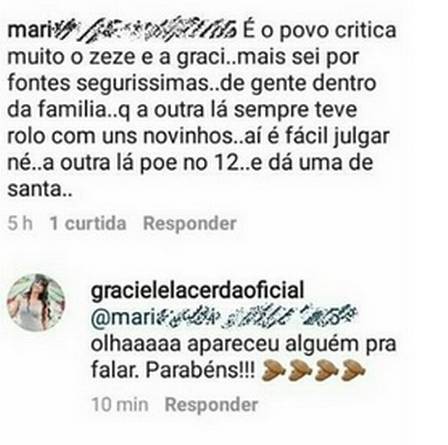 “É, o povo critica muito o Zezé e a Graci, mas sei, por fontes seguríssimas, de gente dentro da família, que a outra lá sempre teve rolo com uns novinhos. Aí é fácil julgar, né? A outra lá põe no 12 e dá uma de santa”, escreveu uma moça.