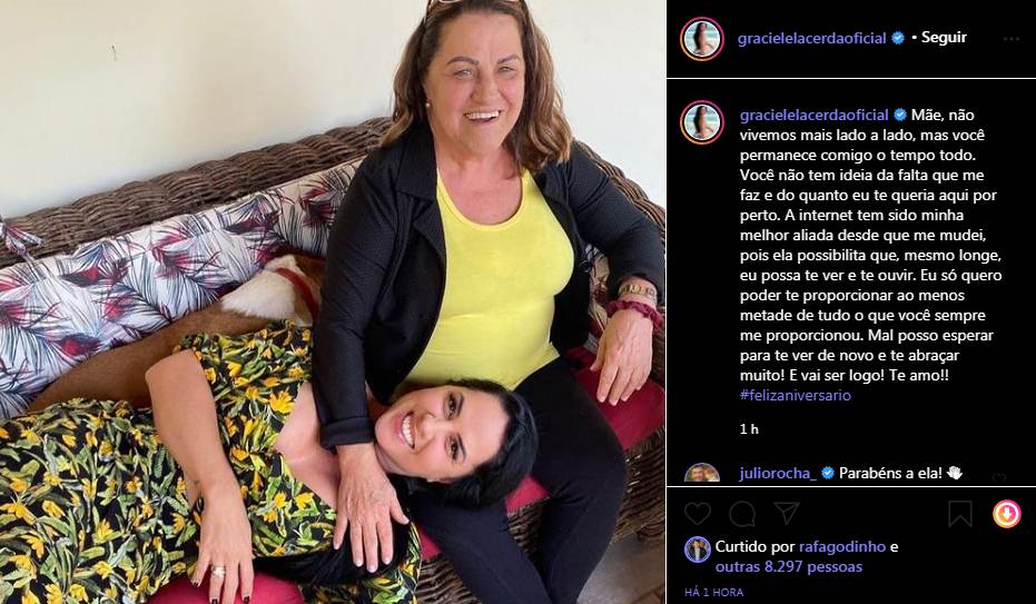 Graciele ainda ressaltou que a distância é amenizada pela tecnologia. “A internet tem sido minha melhor aliada desde que me mudei, pois ela possibilita que, mesmo longe, eu possa te ver e te ouvir”, escreveu.