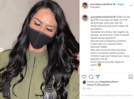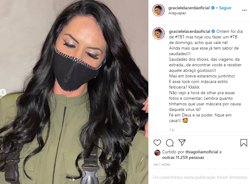 Graciele Lacerda ainda brincou com sua roupa. “E esse look com máscara estilo feiticeira? Não vejo a hora de olhar pra essas fotos e comentar: Lembra quanto tínhamos que usar máscara por causa daquele vírus lá? Fé em Deus e se puder, fique em casa!”, falou.