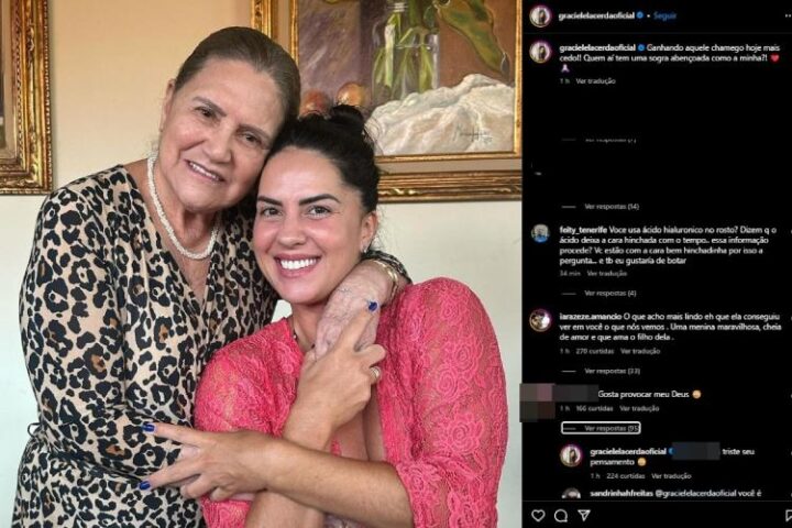 Tudo começou quando Graciele mostrou a foto bastante sorridente com a Dona Helena e colocou uma legenda bem carinhosa para a mãe de seu noivo: “Ganhando aquele chamego hoje mais cedo!! Quem aí tem uma sogra abençoada como a minha?!”, escreveu ela no feed do Instagram, onde possui milhões de seguidores. Adiante, a internauta deu aquela alfinetada na esposa do cantor: “Gosta de provocar, meu Deus”, escreveu a pessoa, sem imaginar que a beldade responderia. Adiante, Lacerda deu sua resposta ‘afiada’, reprovando o comentário da seguidora: “Triste seu pensamento”, criticou ela, com um emoji lamentando.
