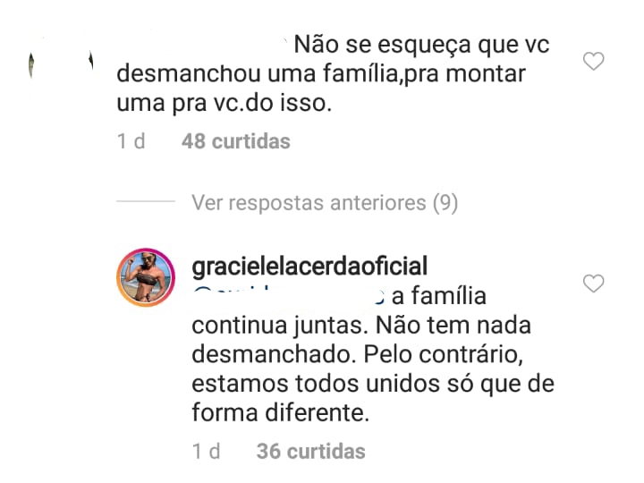 “Não se esqueça que você desmanchou uma família para montar uma para você, só isso!”, escreveu a seguidora.