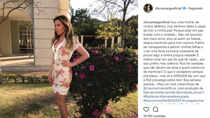 “Não me escondo dos meus erros, pois se assim eu fizesse, estaria mentindo para mim mesma! Prefiro ser transparente e admitir minhas falhas a viver uma farsa na busca incessante de provar algo à minha própria vaidade! É melhor estar em paz do que ter razão… por isso prefiro meu silêncio! Pois há verdades que não devem ser ditas a quem sobrevive de mentiras!!! O que é verdadeiro sempre prevalece… mas só a VERDADE faz com que a PAZ prevaleça sobre nós!!“, escreveu Zilu.