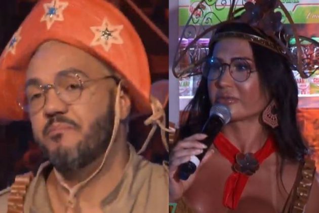 “O que você tá fazendo aí? Eu não sei nem o que você tá fazendo, até porquê está todo mundo olhando pra barraca do beijo. Não dá risadinha não, não brinca com coisa séria”, retrucou Belo, aos músicos, enquanto rendia a risada dos mesmos. “Beijar a Maria Bonita não vai ser fácil não”, afirmou Gracyanne. “Só eu que posso te beijar, hein?”, decretou. “Depende do que você vai fazer pra ganhar um beijinho meu”, disse a morena. “Pra eu ganhar um beijinho seu eu faço qualquer coisa”, afirmou.