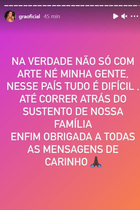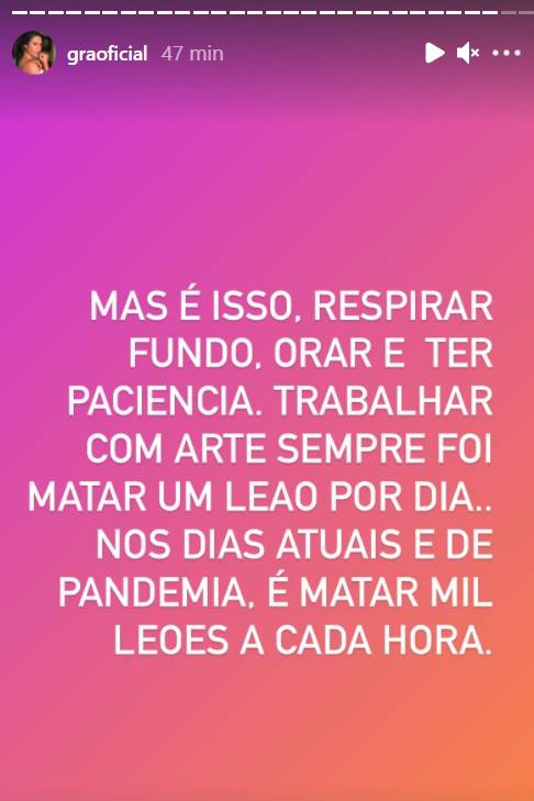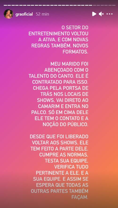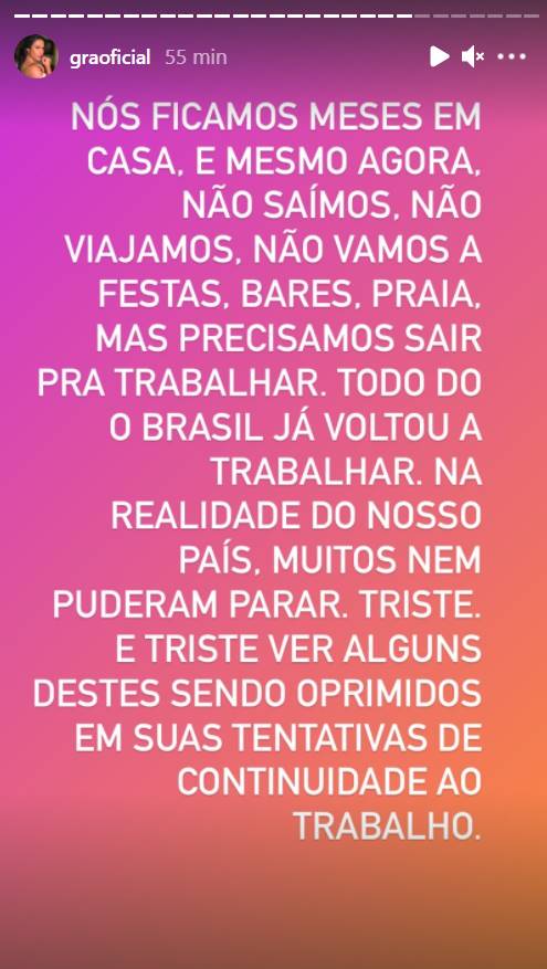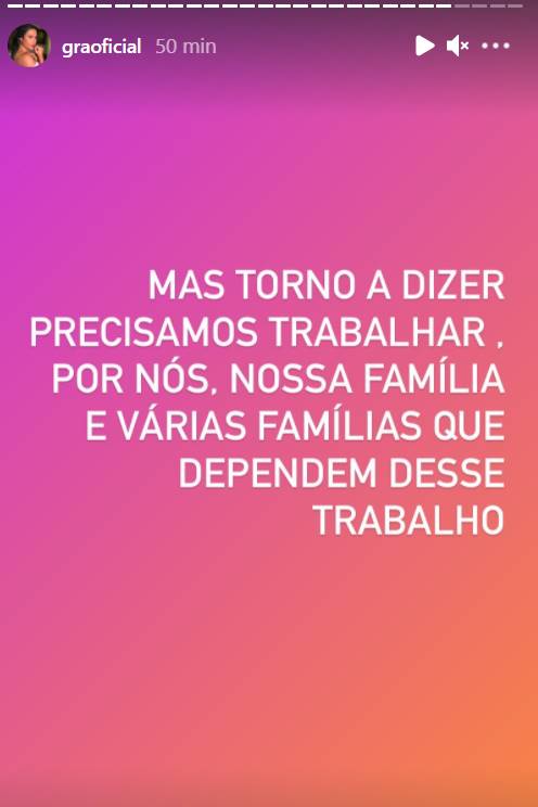 Logo na sequência, Gracyanne ainda afirma que ela e o marido ficaram meses em casa cumprindo quarentena. “Nós ficamos meses em casa, e mesmo agora, não saímos, não viajamos, não vamos a festas, bares, praia. Mas precisamos sair pra trabalhar. Todo o Brasil já voltou a trabalhar. Na realidade do nosso país, muitos nem puderam parar. Triste. E triste ver alguns desses sendo oprimidos em suas tentativas de continuidade ao trabalho.“, continuou.