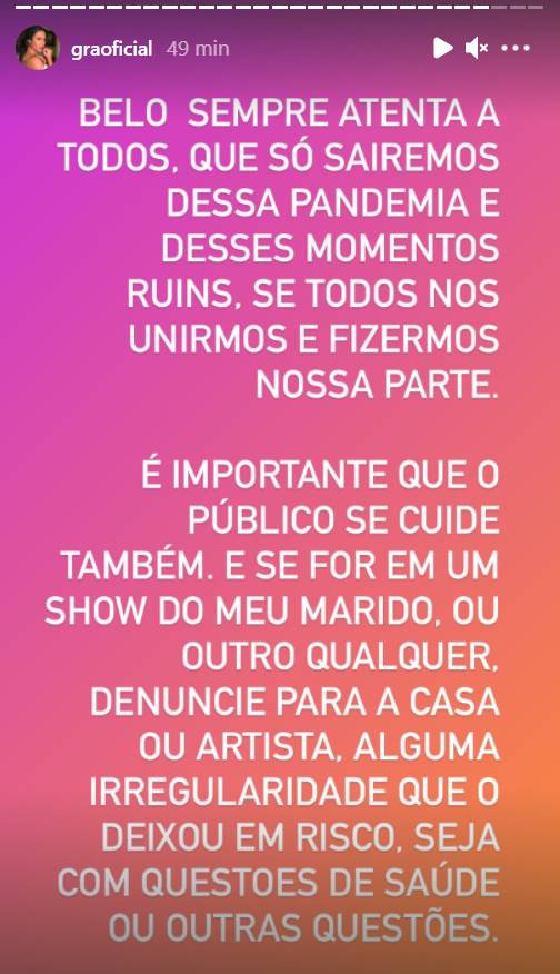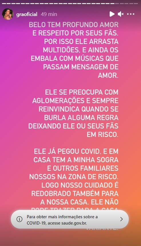 Enfim, a influenciadora ainda diz que o cantor não tem contato com o grande público e cumpre o protocolo de testes antes de cada evento. Além disso, logo em seguida, conta que o cantor se preocupa em não levar o vírus para casa por conta dos familiares que são do grupo de risco da doença.