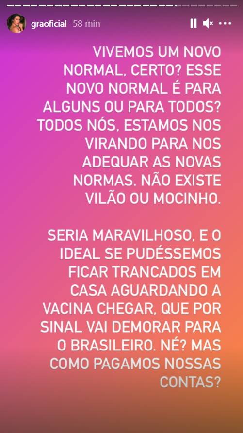 ”Vivemos um novo normal, certo? Esse novo normal é para alguns ou para todos? Todos nós estamos nos virando para nos adequar às novas normas. Não existe vilão ou mocinho. Seria maravilhoso e o ideal se pudéssemos ficar trancados em casa aguardando a vacina chegar, que por sinal vai demorar para o brasileiro, né? Mas como pagamos nossas contas?“, questiona ela, inicialmente.