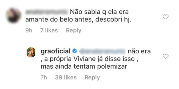 “Não sabia que ela [Gracyanne] era amante do Belo antes, descobri hoje”, comentou a seguidora. “Não era [amante]. A própria Viviane já disse isso, mas ainda tentam polemizar”, respondeu Gracyanne.
