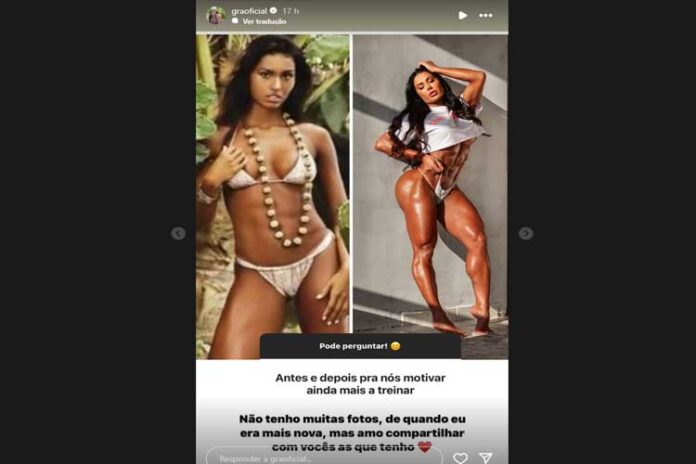 Através de seu Stories no Instagram, a musa fitness resgatou um registro raro de quando era mais jovem, impressionando o público com a diferença. Na imagem, Gracyanne aparece sem toda a definição conquistada após anos de trabalho duro e dedicação no esporte.