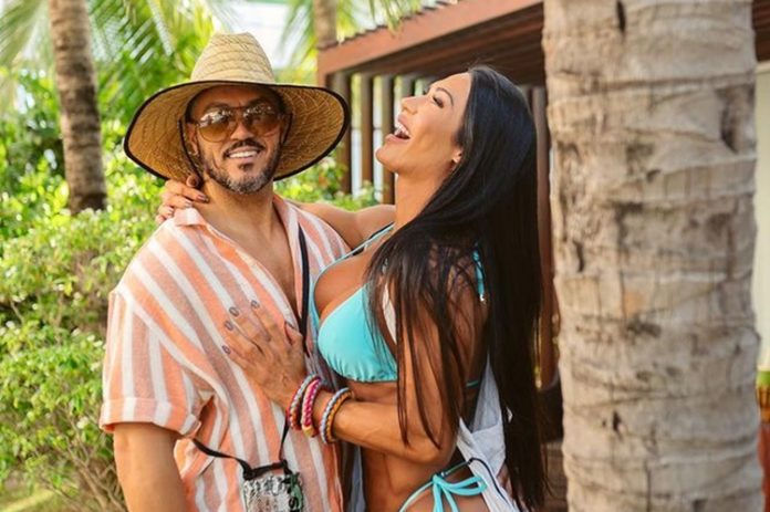 De biquíni azul e feliz da vida, Gracyanne fez poses e surgiu agarradinha com o cantor. Na legenda, ela escreveu: “Start na lua de mel ❤️ Foi lindo mesmo durando 1 dia 😂 Quem acompanha entenderá rs.”
