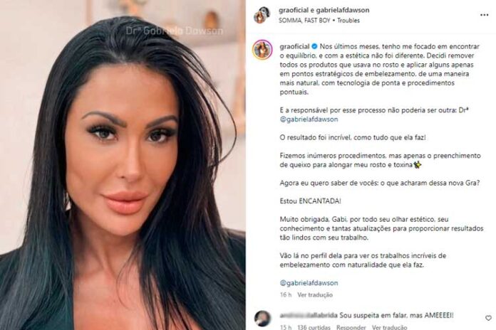 A musa fitness também celebrou o resultado. “O resultado foi incrível! Fizemos inúmeros procedimentos, mas apenas o preenchimento de queixo para alongar meu rosto e toxina. Agora eu quero saber de vocês: o que acharam dessa nova Gra? Estou ENCANTADA!”, afirmou.