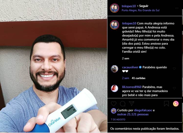 Quando saiu o resultado positivo do teste de gravidez, Thiago fez questão de compartilhar. “Com muita alegria informo que serei papai. A Andressa está grávida!! Meu filho(a) foi muito desejado(a) por mim e pela Andressa. Amanhã já vou comemorar o meu dia (dia dos pais). Estou ansioso para carregar o meu filho(a) no colo. Família cristã sim!”, escreveu.