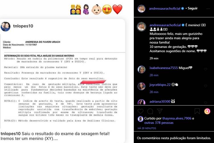 Em seu perfil no Instagram, a modelo publicou o resultado do exame, que garante ter 98% da probabilidade do feto ser do sexo masculino. Feliz da vida, Andressa comemorou. “É menino! Muitooooo feliz, mais um gurizinho pra trazer ainda mais alegria para nossa família! 10 semanas de gestação”, disse ela, que ainda pediu ajuda aos seguidores. “Aceitamos sugestões de nome”, finalizou.