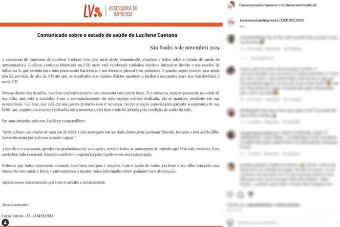 “Mesmo diante dos desafios, Lucilene está enfrentando este momento com muita força, fé e coragem, sempre pensando na saúde de sua filha, que está a caminho. Com o acompanhamento de uma equipe médica dedicada, ela se mantém confiante em sua recuperação”, afirmaram.