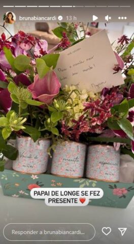 Dessa forma, por meio dos stories no Instagram, Bruna Biancardi compartilhou uma foto do presente que Neymar lhe enviou, já que ambos estão longe um do outro, devido a compromissos. No entanto, mesmo distantes fisicamente o craque do PSG se fez presente no ‘Dia das Mães’ e enviou a modelo um modesto buquê de flores em latas decoradas, com direito a uma cartão com uma mensagem simples, mas afetuosa.