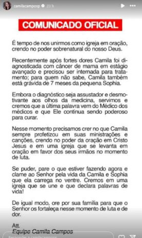 “É tempo de nos unirmos como igreja em oração, crendo no poder sobrenatural do nosso Deus. Recentemente, após fortes dores, Camila foi diagnosticada com câncer de mama em estágio avançado e precisou ser internada para tratamento; para quem não sabe, Camila também está grávida de 7 meses da pequena Sophia”, iniciou a assessoria de Camila.