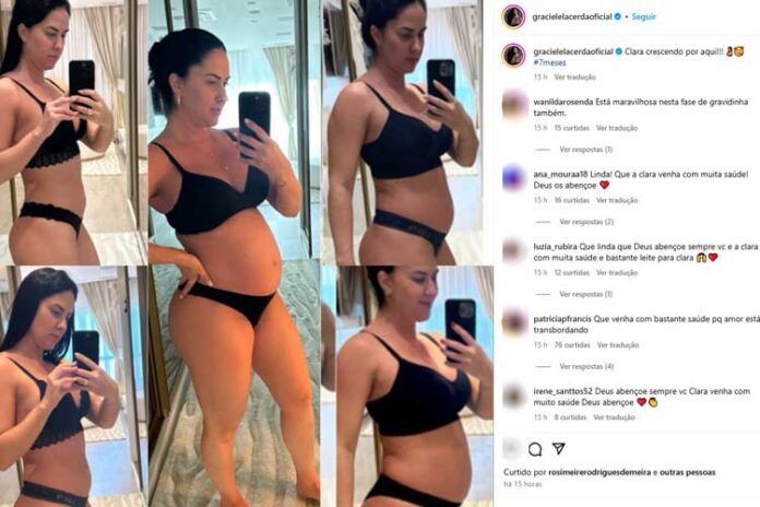 Graciele Lacerda mostrou a evolução de sua gestação nas redes sociais. Grávida da primeira filha com o cantor Zezé Di Camargo, a influenciadora celebrou os 7 meses de gravidez.