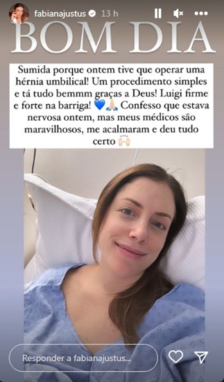 Segundo a empresária, a cirurgia foi necessária devido ao diagnóstico de uma hérnia umbilical. “Sumida porque ontem tive que operar uma hérnia umbilical! Um procedimento simples e está tudo bem, graças a Deus! Luigi firme e forte na barriga. Confesso que estava nervosa ontem, mas meus médicos são maravilhosos, me acalmaram e deu tudo certo”, escreveu ela nos stories de seu perfil oficial no Instagram.